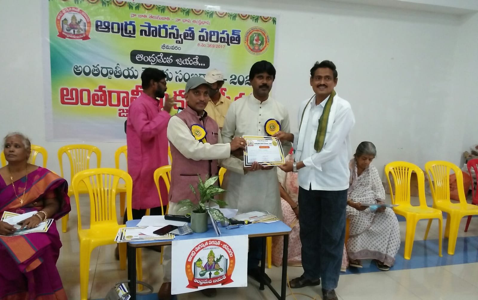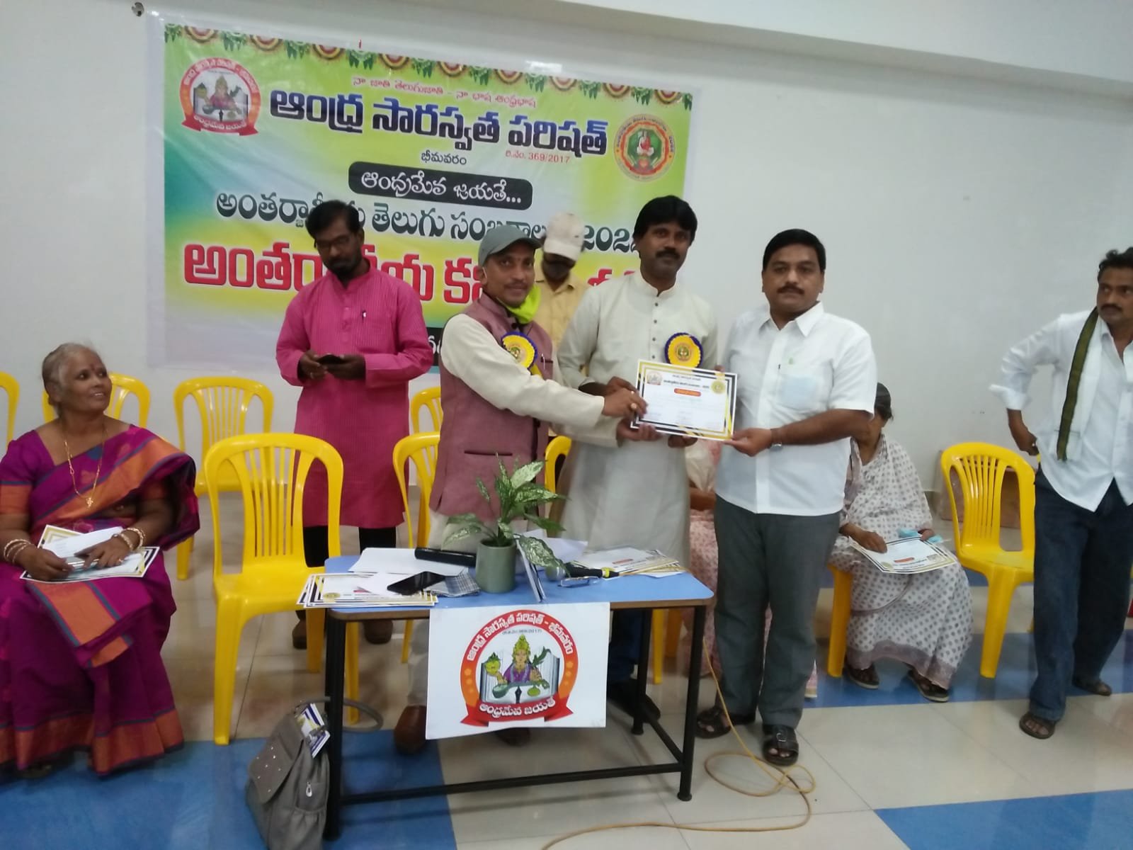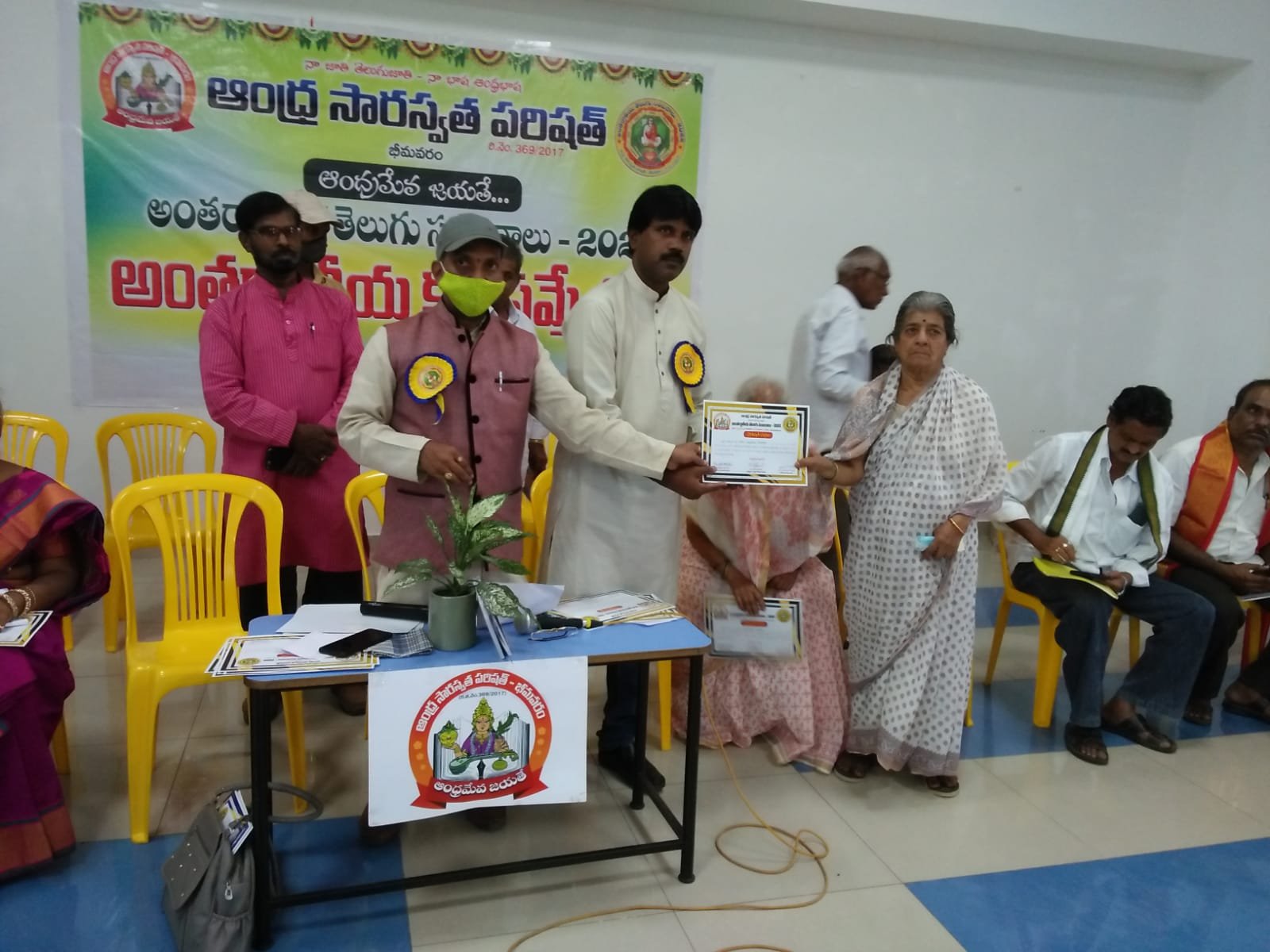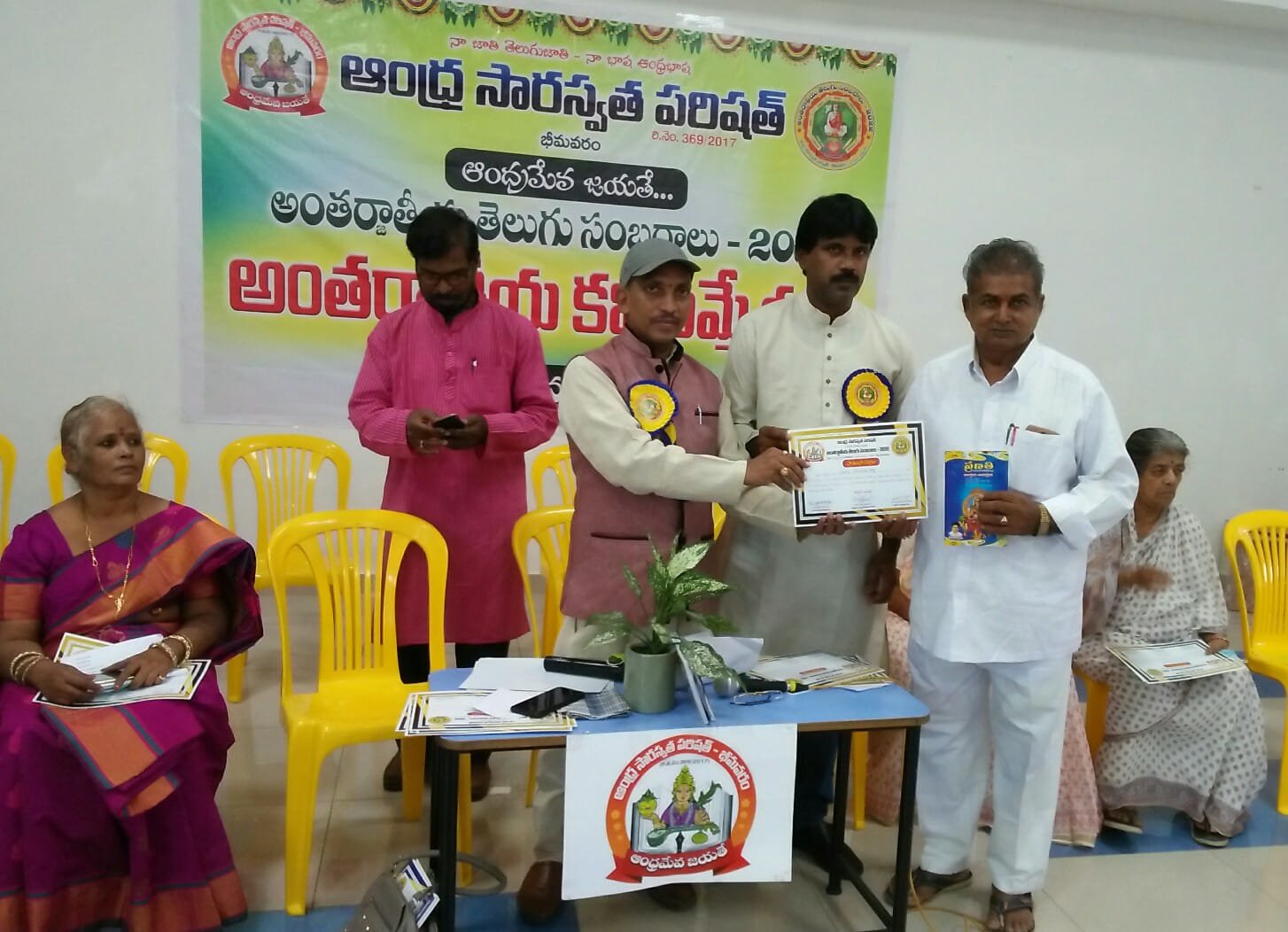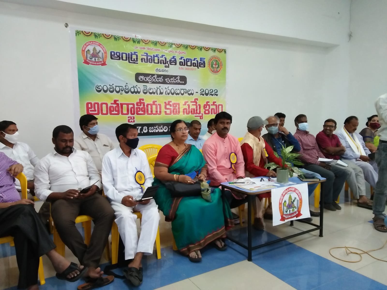 After the bifurcation of the united Andhra Pradesh, the Andhra Saraswata Parishad organization in Hyderabad was renamed Telangana Saraswata Parishad. With the noble intention of continuing the glory of the Telugu language in the new Andhra state, in 2017, under my leadership as President, along with Dr. Kadimilla Varaprasad and Sri Medikonda Srinivas as Vice Presidents, Sri Chakravadhanula Reddappa Daveji as Secretary, Sri Rayaprolu Bhagavan as Treasurer, and Sri Ponnapalli Rama Rao and Sri Manthena Ramakumar Raju as Joint Secretaries, we registered the organization in Bhimavaram and began conducting activities from a temporary office.