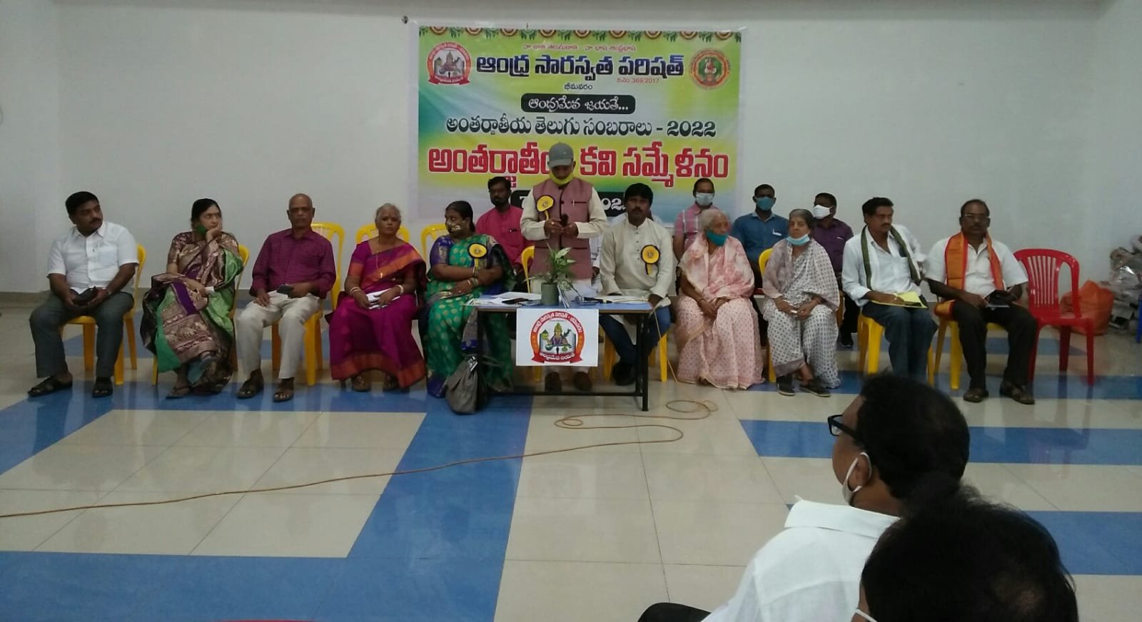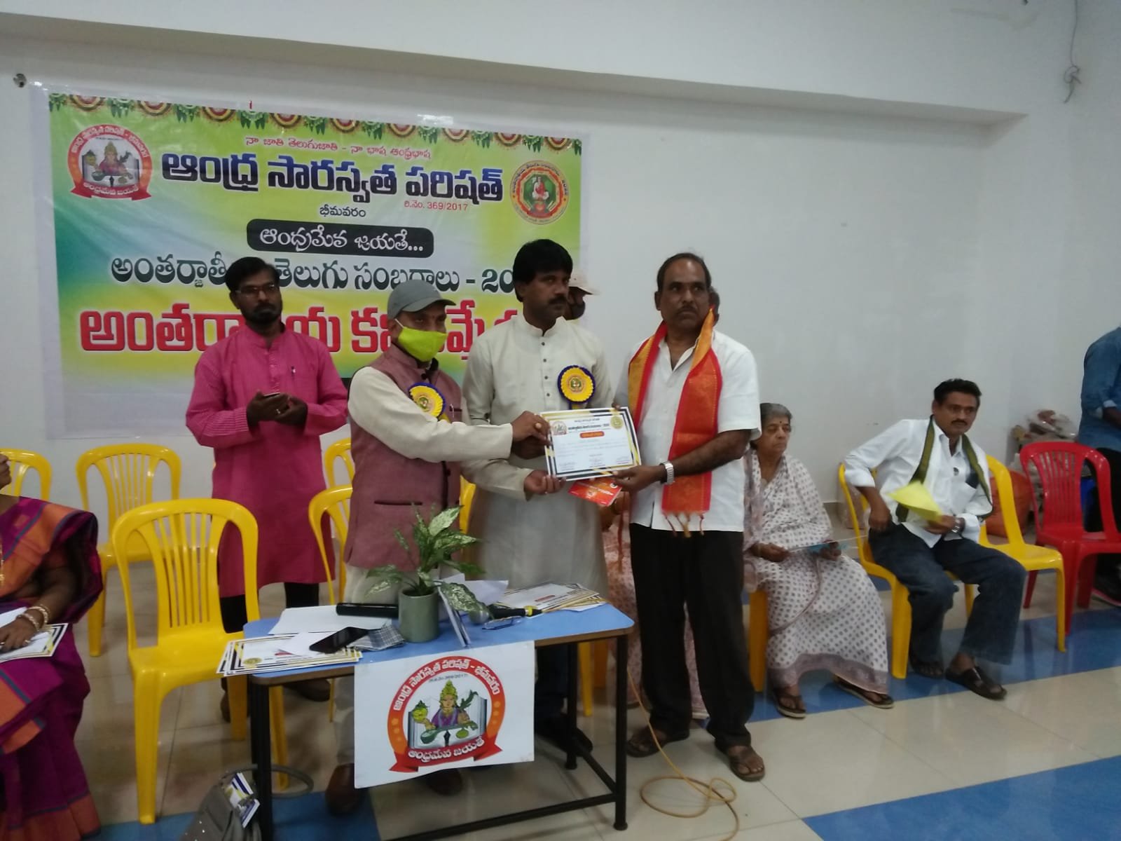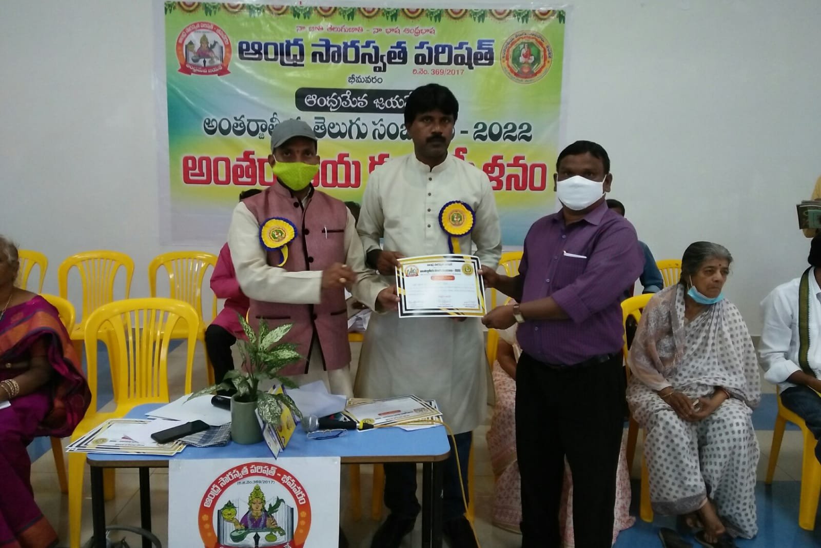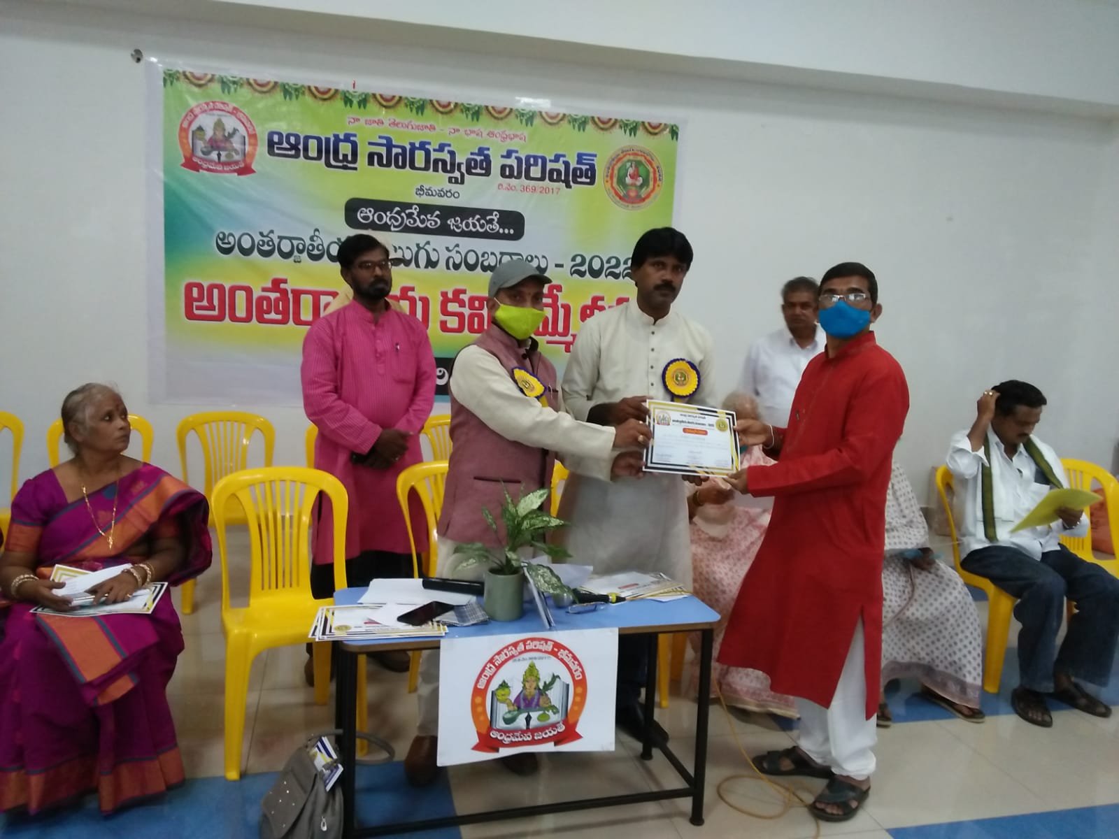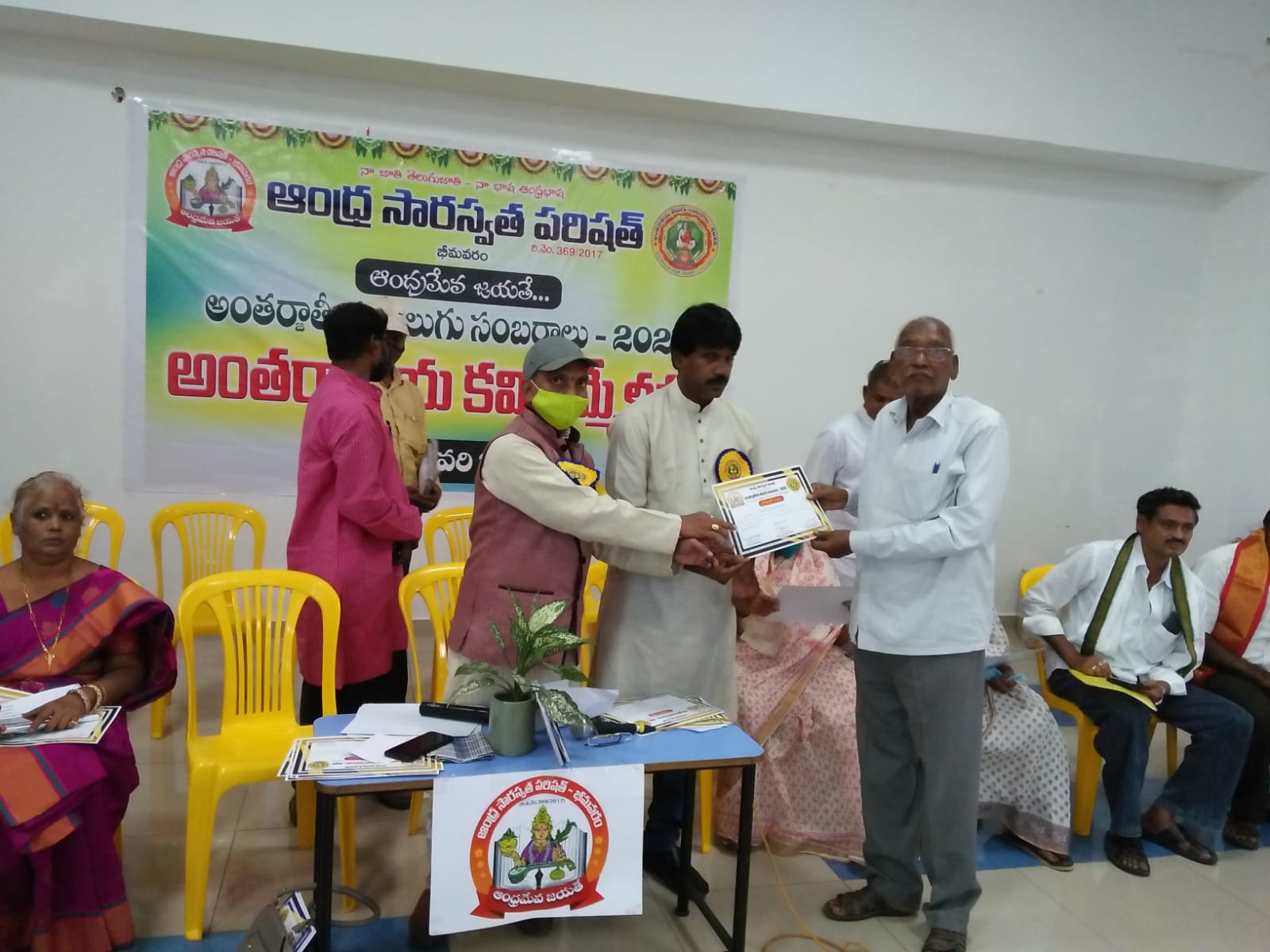 After the bifurcation of the united Andhra Pradesh, the Andhra Saraswata Parishad organization in Hyderabad was renamed Telangana Saraswata Parishad. With the noble intention of continuing the glory of the Telugu language in the new Andhra state, in 2017, under my leadership as President, along with Dr. Kadimilla Varaprasad and Sri Medikonda Srinivas as Vice Presidents, Sri Chakravadhanula Reddappa Daveji as Secretary, Sri Rayaprolu Bhagavan as Treasurer, and Sri Ponnapalli Rama Rao and Sri Manthena Ramakumar Raju as Joint Secretaries, we registered the organization in Bhimavaram and began conducting activities from a temporary office.